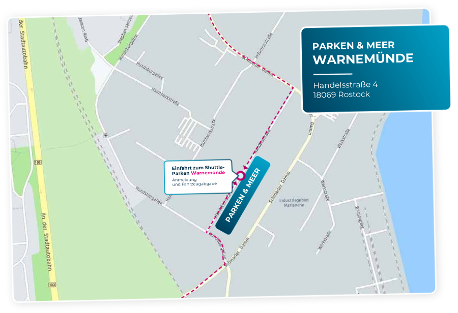 Unkompliziert und meistens staufrei kommen Sie über die Autobahn A 20 zu uns. An der Anschlussstelle „Rostock-West“ fahren Sie bitte auf die B 103 in Richtung Rostock ab. Folgen Sie dieser Straße etwa 18 km. Sie erreichen die Kreuzung „Schutower Kreuz“. Bitte fädeln Sie sich auf der rechten Spur ein und nehmen die vorausliegende rechte Abfahrt Richtung „Schmarl“. Achtung: Fahren Sie bitte an der Ampelkreuzung nicht direkt nach rechts in die Straße „An der Jägerbäk“ ab – fahren Sie unbedingt gerade aus auf die vorausliegende Abfahrt. Sie folgen der Straße „Schmaler Damm“ und überqueren eine Ampelkreuzung. Nutzen Sie, nach einer langgezogenen Links-Kurve, die nächste Möglichkeit um links abzubiegen. Damit befinden Sie sich bereits in der Handelsstraße. Dort sehen Sie dann unsere Hinweisschilder, die Sie auf unser Parkgelände mit dem grünen Zaun leiten. (nach ca. 300 m - Einfahrt auf der linken Seiten).