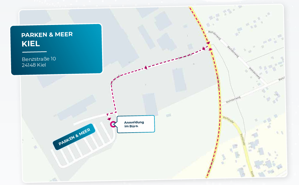Wenn Sie aus dem Osten, etwa über Lübeck, Plön oder Rostock anreisen, folgen Sie zunächst den Hauptverkehrswegen (A20 von Rostock oder A1/B76 von Lübeck/Plön) in Richtung Kiel. Fahren Sie über den angrenzenden Stadtteil Ellerbek, westlich von Wellingdorf gelegen. Von dort gelangen Sie über die Wellingdorfer Straße oder den Ostring (B 502) nach Wellingdorf. Nehmen Sie dann die Abfahrt Benzstraße (Abfahrt direkt hinter der JET-Tankstelle) und biegen Sie anschließend rechts auf den Wehdenweg ab. Nach etwa 1,3 Kilometern biegen Sie dann noch einmal rechts in die Benzstraße. Folgen Sie der Straße bis Sie uns erreichen.