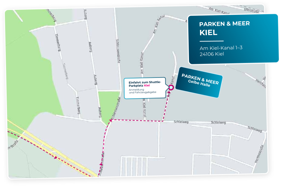 Wenn Sie unkompliziert und mit dem geringsten Staurisiko Ihren Urlaub beginnen möchten, fahren Sie einfach über die A 7 in nördlicher Richtung und biegen Sie an der Ausfahrt 12 Dreieck Bordesholm auf die A 215 Richtung Kiel/Blumenthal ab. Verlassen Sie die A 215 an der Anschlussstelle Kiel-Mitte und fahren auf der B 76 in Richtung Flensburg/Eckernförde. Nachdem die B 76 in die B 503 übergegangen ist, verlassen Sie die B 503 an der Ausfahrt "Kiel-Wik", "Nord-Ostsee-Kanal" und "Marinestützpunkt". Dadurch gelangen Sie automatisch auf die Prinz-Heinrich-Straße. An der ersten Ampel-Kreuzung biegen Sie links in die Schleusenstraße ab, um nach 200 m rechts in den Schleiweg abzubiegen. Danach biegen Sie die ZWEITE Möglichkeit links ab in die Straße Am Kiel-Kanal. Nach ca. 100 m erreichen Sie auf der rechten Seite unsere Parkhalle, die aufgrund ihrer gelben Farbe weithin sichtbar ist.