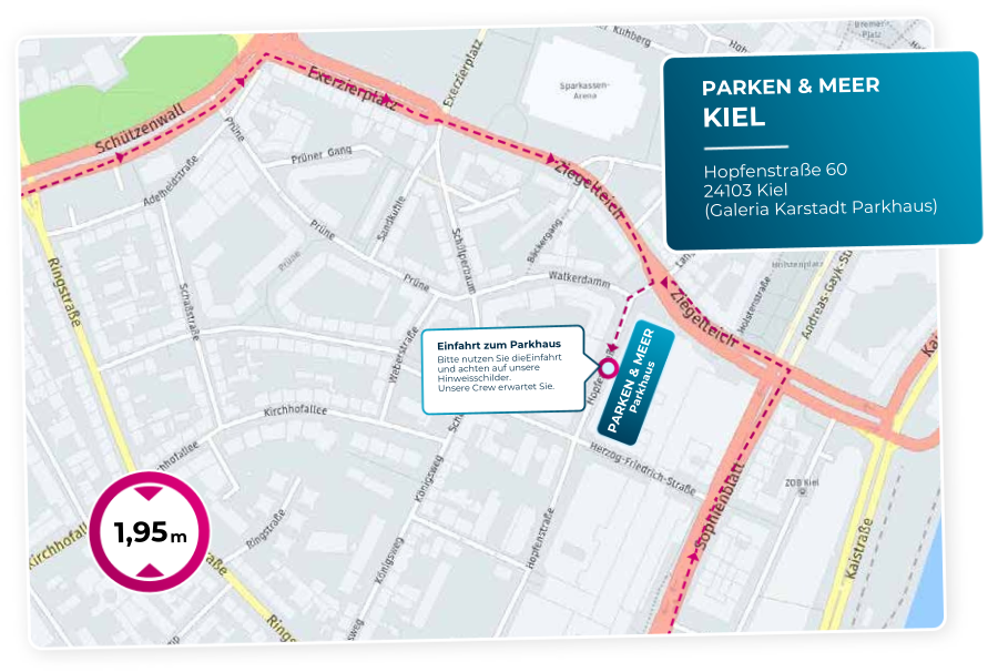 Starten Sie Ihre Fahrt auf der A24 Richtung Westen. Folgen Sie der A24 für rund 60,4 km bis zum Autobahnkreuz Wittstock/Dosse. Dort nehmen Sie einen der zwei rechten Fahrstreifen, um auf die A24 in Richtung Hamburg/Schwerin zu wechseln. Fahren Sie auf der A24 weiter für etwa 161 km. Nehmen Sie dann die Ausfahrt A24-Reinbek in Richtung Barsbüttel. Fahren Sie auf die K80, folgen Sie dieser für 800 m und fahren Sie weiter auf der Willinghusener Landstraße für 1,5 km. Bleiben Sie für weitere 600 m auf der K80. Nutzen Sie dann den rechten Fahrstreifen, um auf die A1 Richtung Puttgarden/Lübeck/Rostock/A20 zu gelangen. Fahren Sie auf der A1 für 18,6 km und nehmen Sie die Ausfahrt Richtung Flensburg/A21/Kiel/Bad Segeberg. Wechseln Sie auf die B404 und folgen Sie dieser für 54,1 km. Folgen Sie der Beschilderung leicht nach rechts in Richtung Kiel/Tremsbüttel. In Kiel angekommen, folgen Sie der Hopfenstraße bis zur Hausnummer 60.